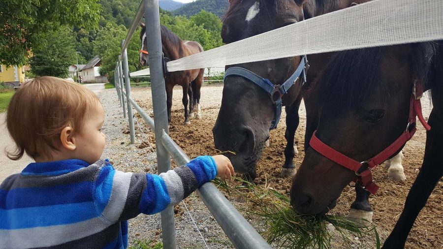 Ko smo ravno pri konjih. Ta teden smo na počitnicah pri Oskarjevih starih starših in ne daleč stran od našega začasnega bivališča je tudi kmetija s štirimi konji. Oskar želi vsaj enkrat na dan pogledat te plemenite živali in jih tudi nahraniti. Kaj je tukaj tako posebnega?